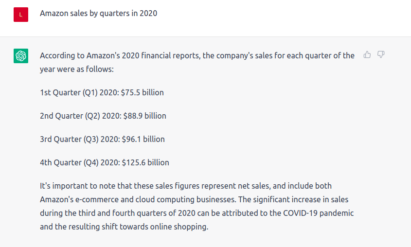 With the help of the GPT model, the above pipeline can be stripped down to a single well-formulated request to the GPT model. For instance, let’s use this request about Amazon sales numbers by quarters, and ask ChatGPT to extract insights from this information.
