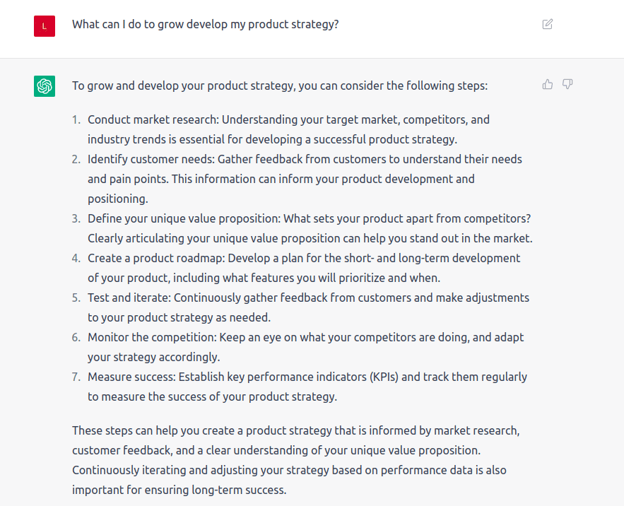 ChatGPT gives advice on how to develop a product strategy