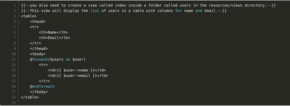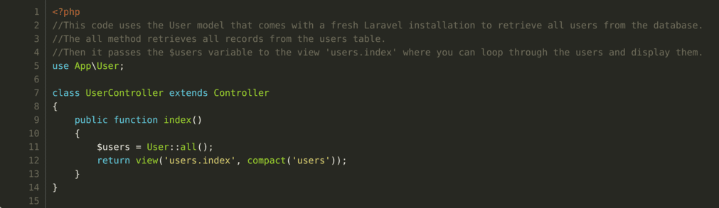 Request: “Write a PHP code on Laravel Framework which will display the list of users”.