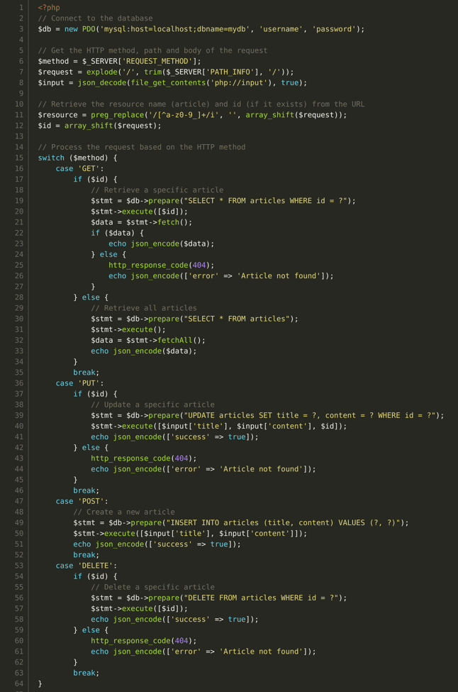 Request: “Write a PHP code which implements REST API with CRUD endpoints for article resource”.