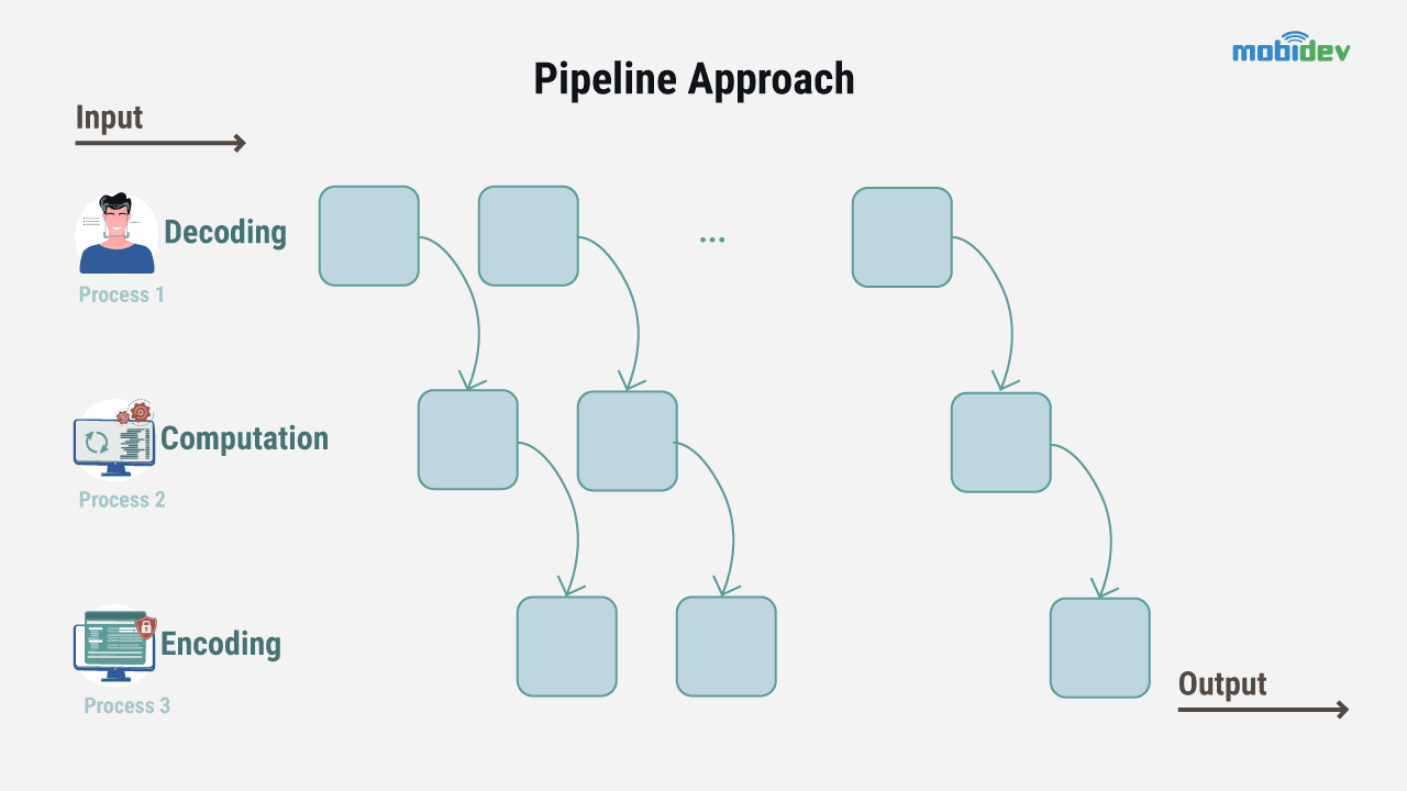 Why is the pipeline approach more flexible? One of the benefits of the pipeline is the ease of manipulation of the components due to requirements. Decoding can work using a video file to encode frames into another file.