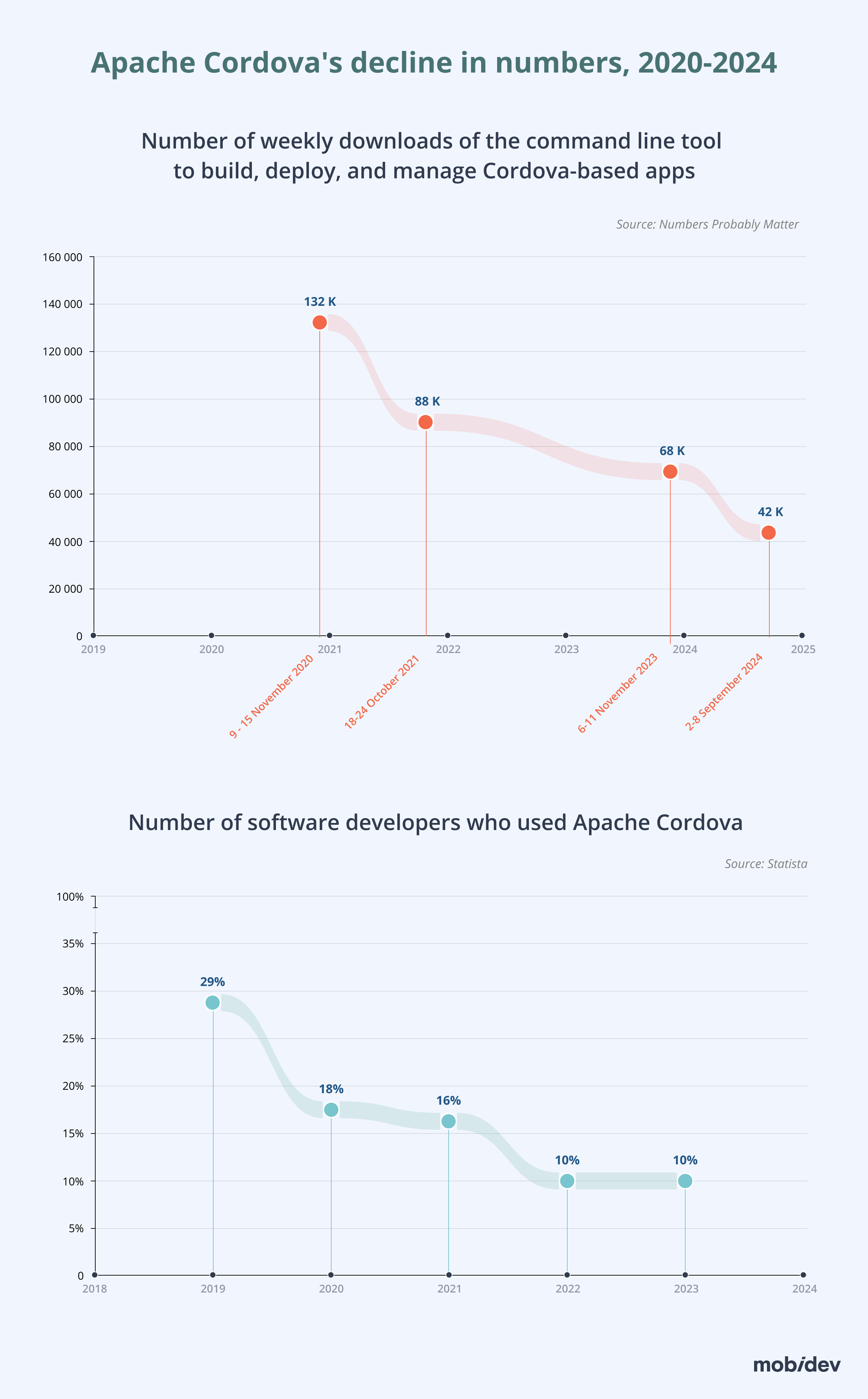 Since 2021, when App Center made a statement about Apache Cordova Retirement, there has been a significant drop in the number of weekly downloads of the command line tool to build, deploy, and manage Cordova-based apps, according to npm (Numbers Probably Matter). Only in the last year did the decrease rate reach 25%.