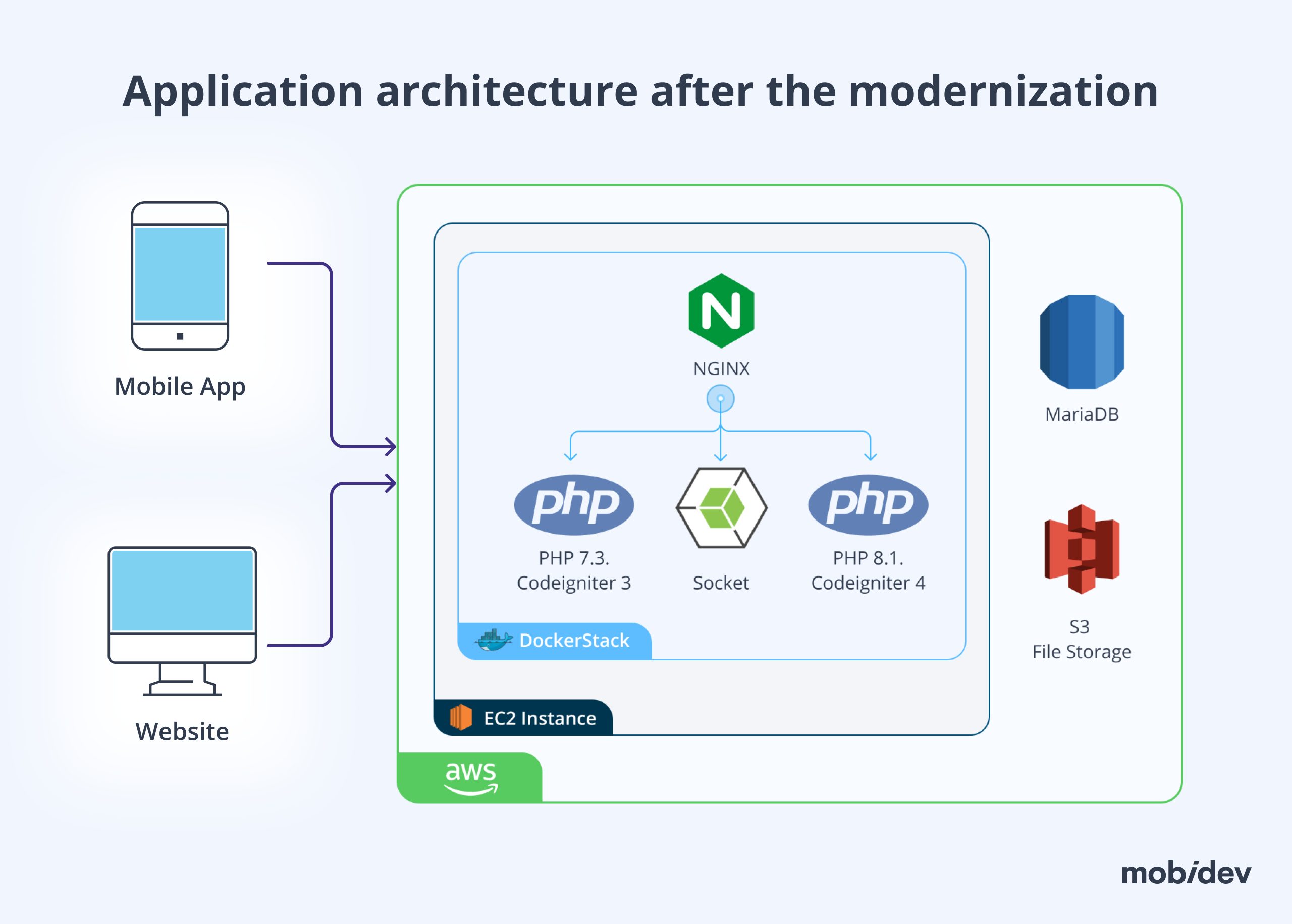 - Built a new scalable architecture: To provide application rearchitecting, we moved the database and file storage from the server to remote services (AWS RDS, AWS S3), which are more stable and secure. We then wrapped the architecture with Docker and isolated each service (NGINX, PHP, and Socket) into containers, enabling stable automatic code delivery (CI/CD) and optimizing server resources.