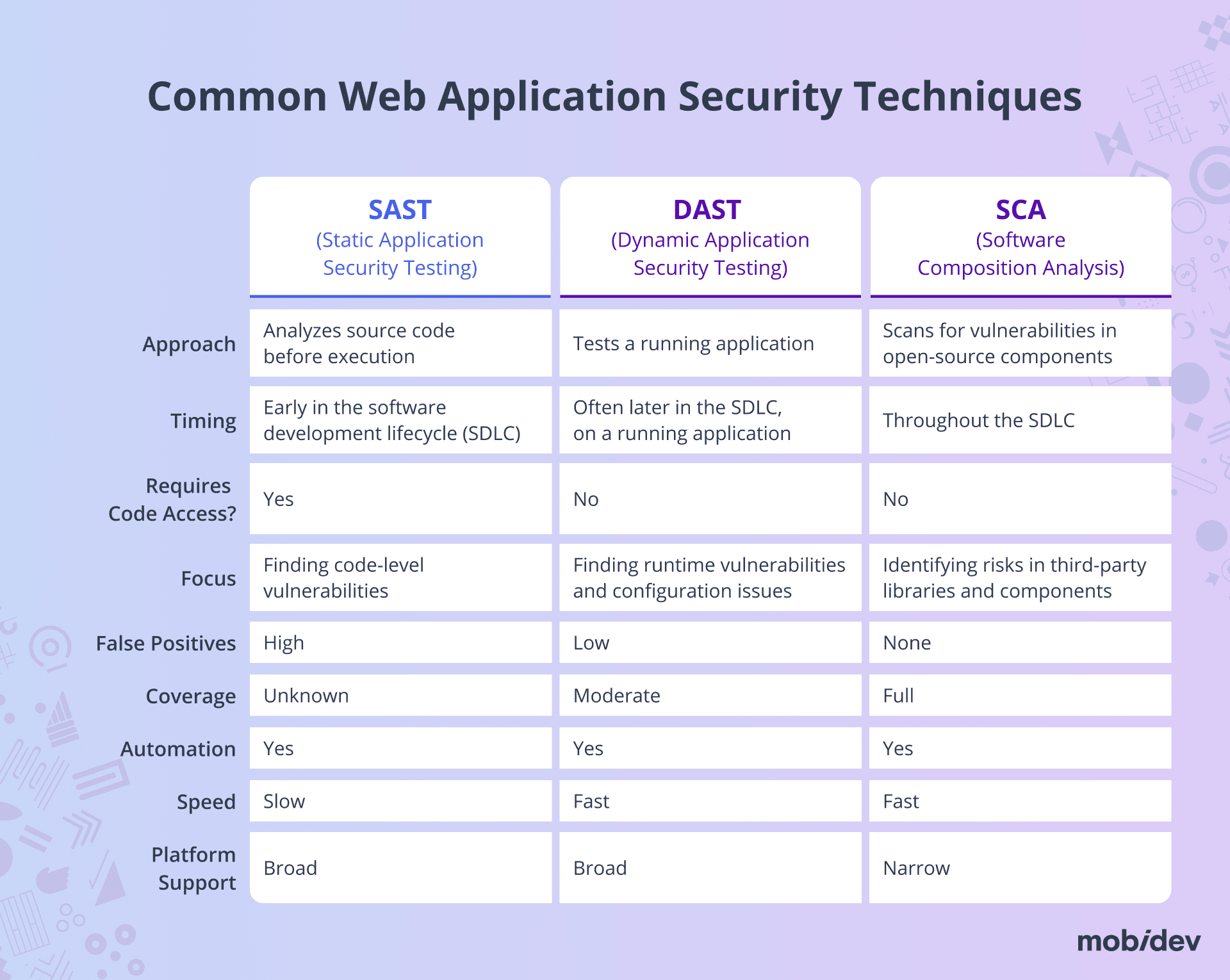 - Combine SAST and DAST: Use Static Application Security Testing (SAST) to identify vulnerabilities during development and Dynamic Application Security Testing (DAST) to catch issues in the running application.