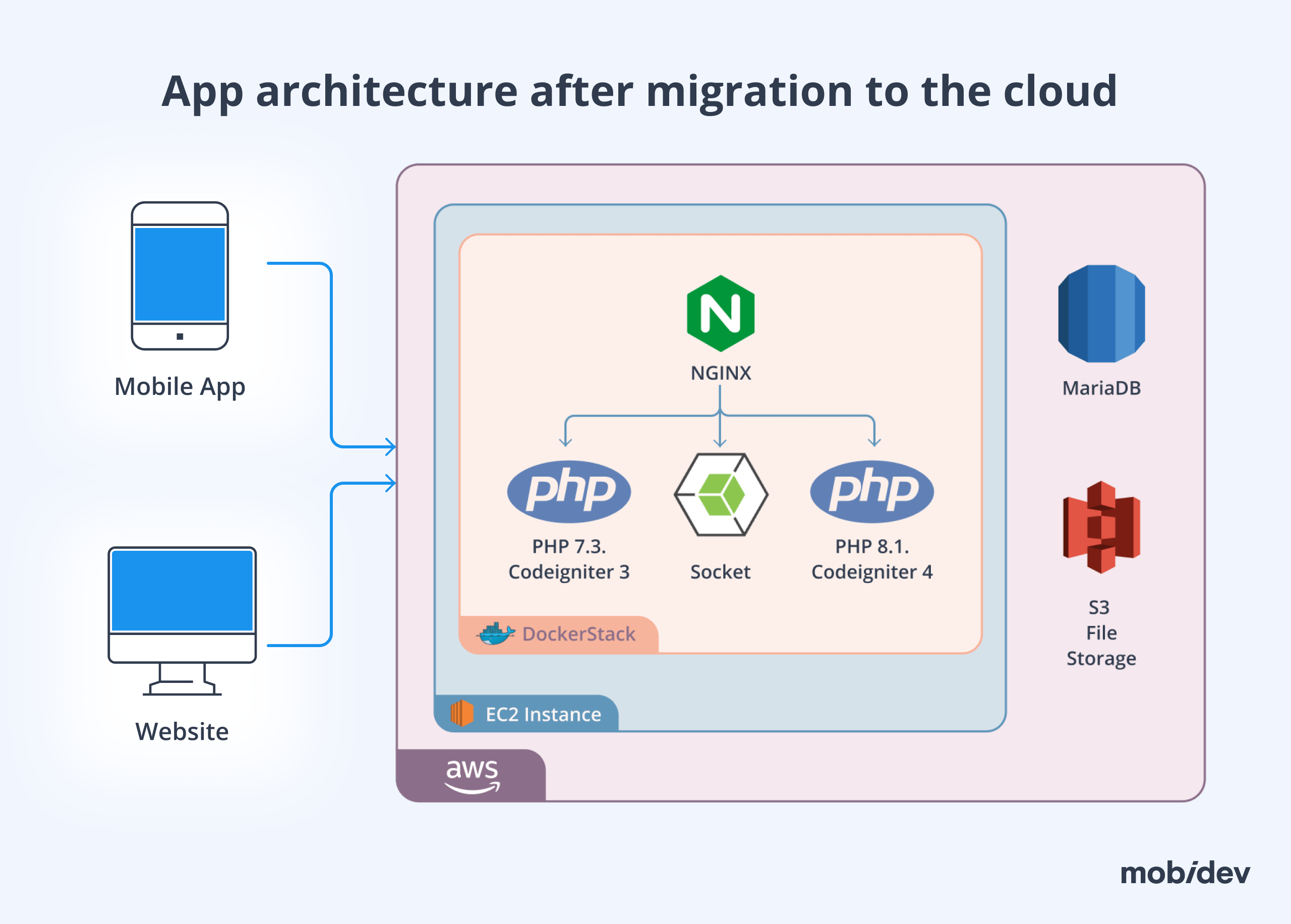 3. Then, it was time to move the code to a newer framework (Codeigniter 4). The MobiDev team used a separate Docker container with a newer version of PHP.