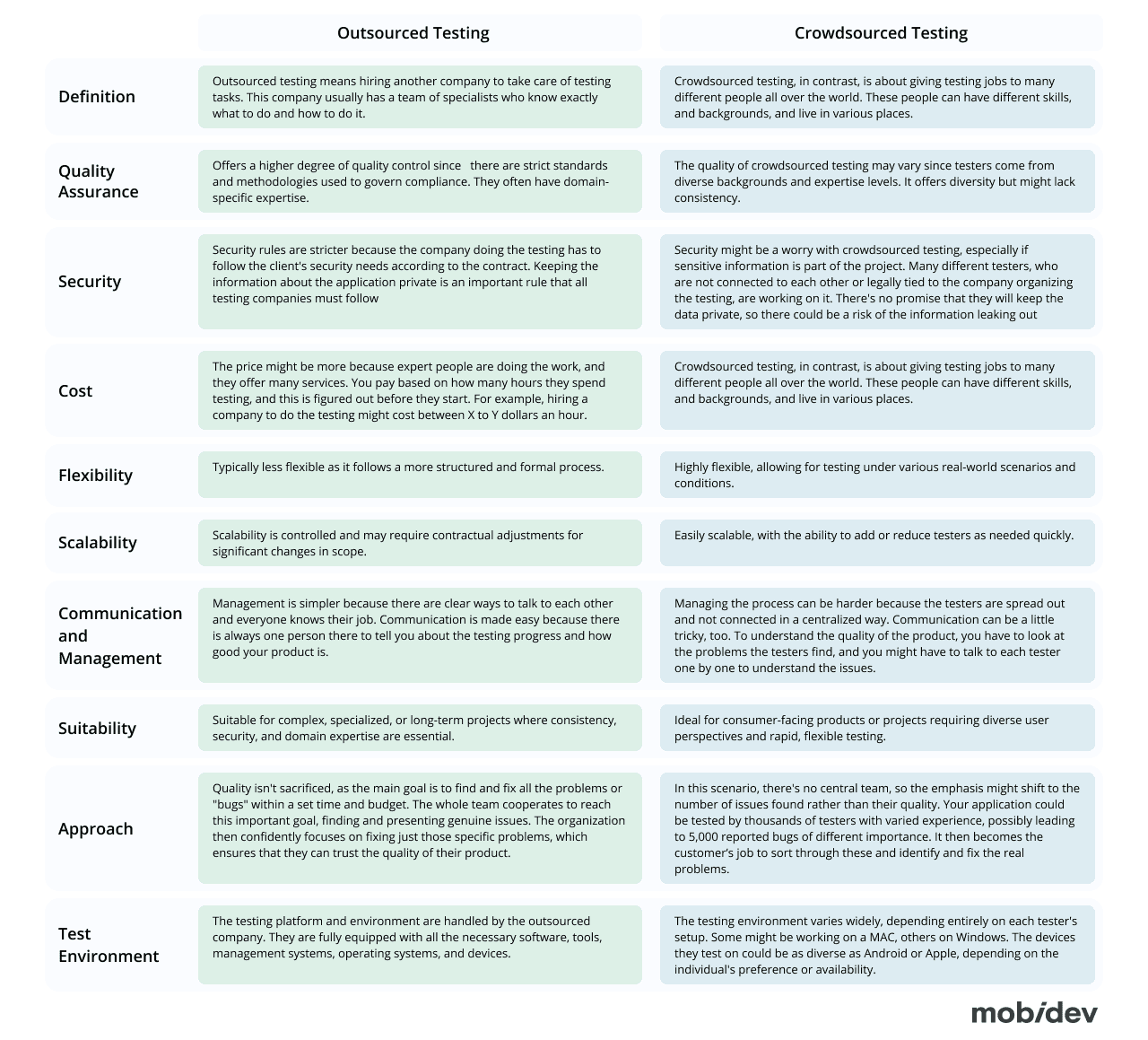 To conclude, crowdsourced testing is all about diversity. It allows for real-world testing conditions, potentially finding unexpected problems and providing insights from a broad range of users and devices. This approach is often more cost-effective and can quickly give feedback. However, it might present challenges in communication, consistency, and data security. Outsourced testing, on the other hand, provides a more controlled, professional environment. With this method, experienced testers follow strict rules and standardized procedures. While this can ensure higher quality, robust communication, and better data security, it may be more expensive and lack the varied insights from different users that crowdsourced testing can offer.
