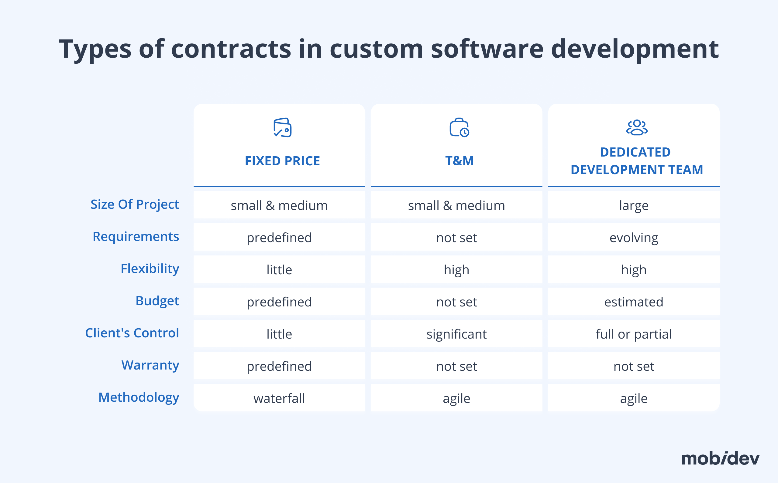 When starting a software development project, understanding the different types of contracts available is also a good thing. Each contract type comes with its advantages and considerations, impacting project management, budgeting, and expectations. Here’s a brief comparison of the key types of software development contracts.
