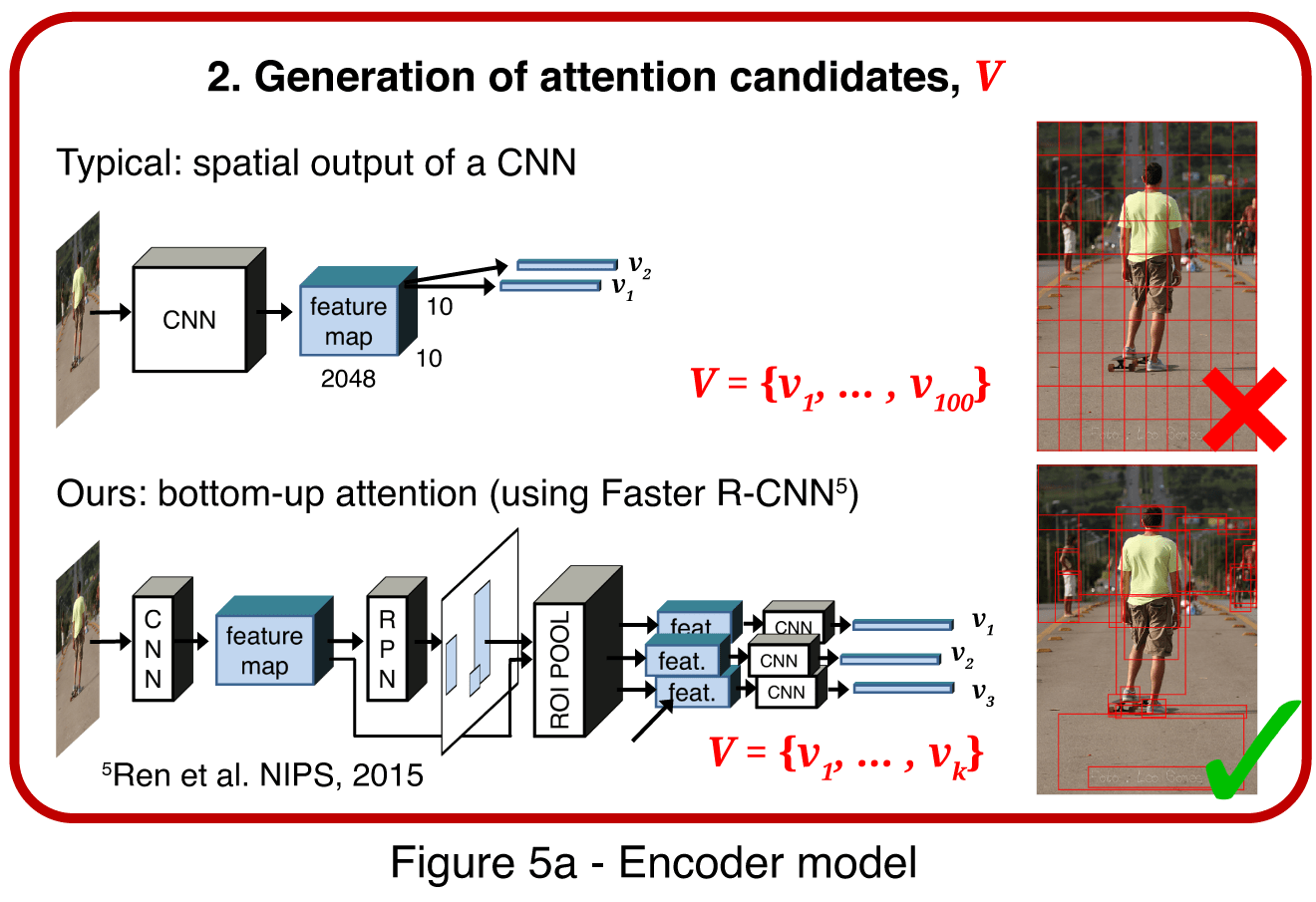 Faster R-CNN is used to establish the connection between object detection and image captioning tasks. The Region proposal model is pre-trained on object detection datasets due to leveraging cross-domain knowledge. Moreover, unlike some other attention mechanisms, both models use one-pass attention with the Up-Down mechanism.