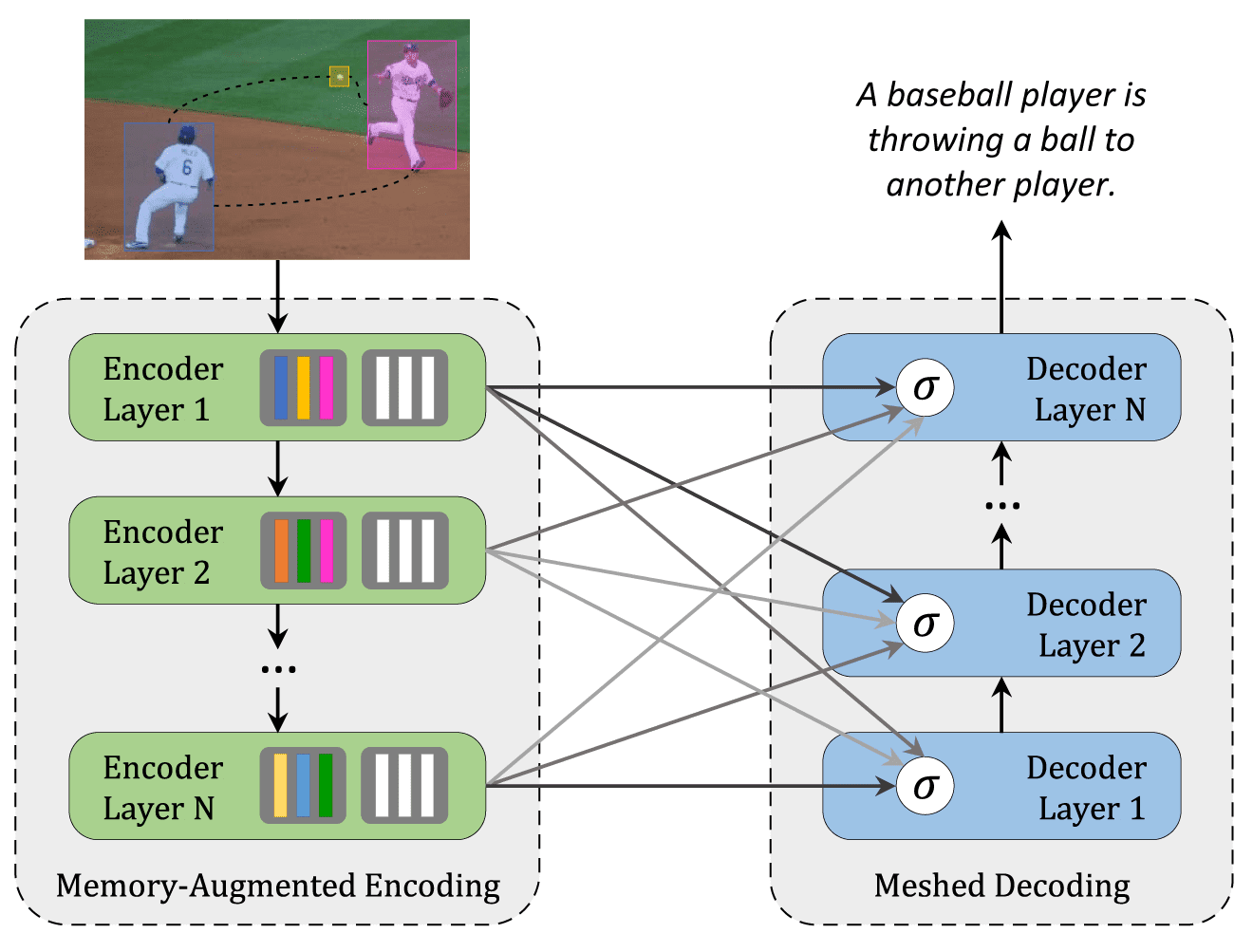 Regions of the image are encoded in a multi-level fashion. The model takes into account both low-level and high-level relations. Learned knowledge is encoded as memory vectors. Layers of encoder and decoder parts are connected in a mesh-like structure. The decoder reads from the output of each encoding layer and performs self-attention on words and cross attention over all encoding layers after that results being modulated and summed.