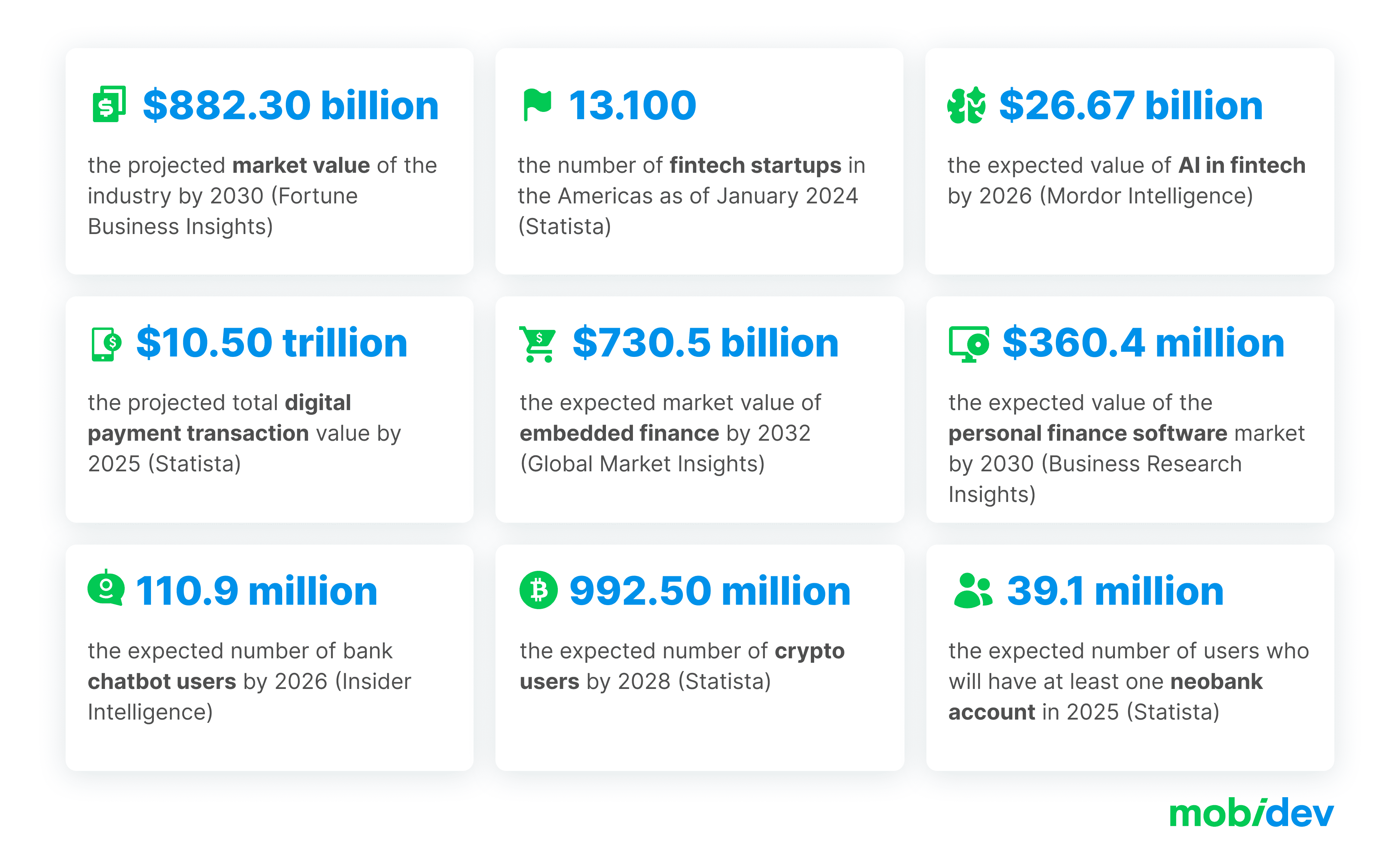 As a fintech market analyst, I spend a lot of time researching financial market trends. Additionally, as a BA Team Lead at MobiDev, which has been developing software products since 2009, I get a clear idea of how this or that trend can meet the real needs of a specific business and become the basis of an effective software solution.