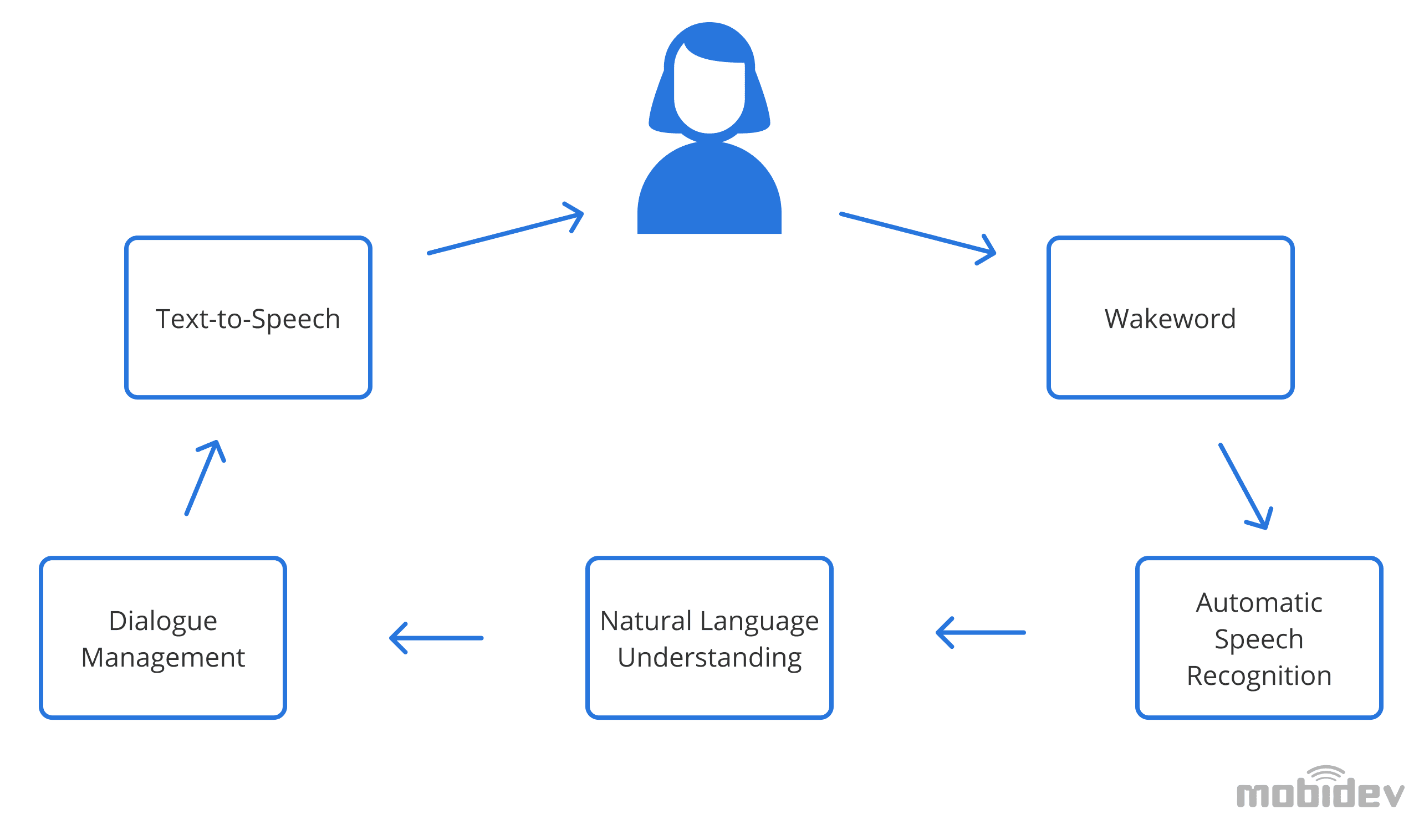 The AI-powered conversational engine ensures seamless communication between a financial app and its users. Two technologies play a central role: Natural language processing (NLP) and Natural Language Understanding (NLU). There is a magic word here called wakeword. This special command triggers the promised miracle of human communication with the financial app.