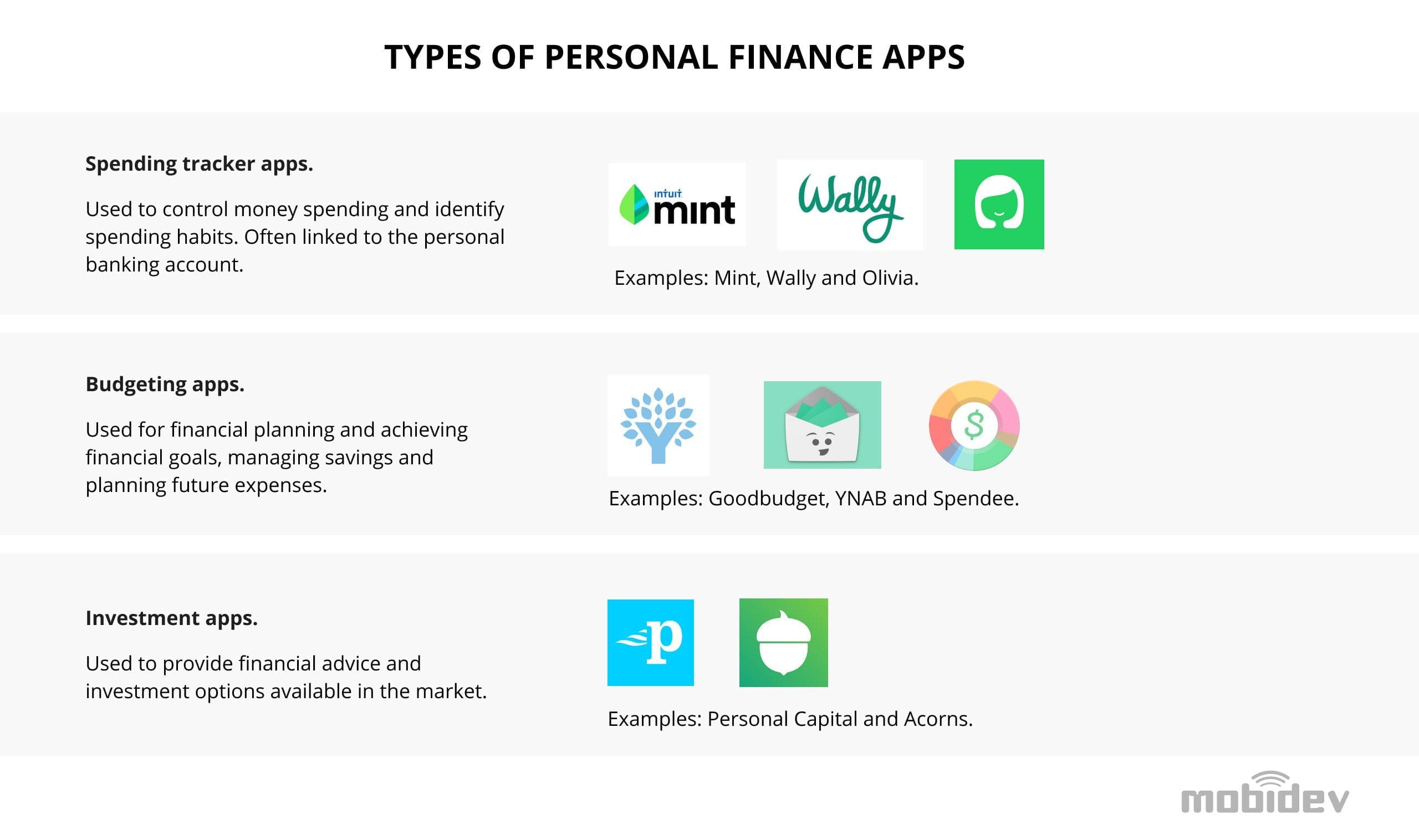 Before we delve into how to build a financial app, let’s find out what types of such software are on the market.