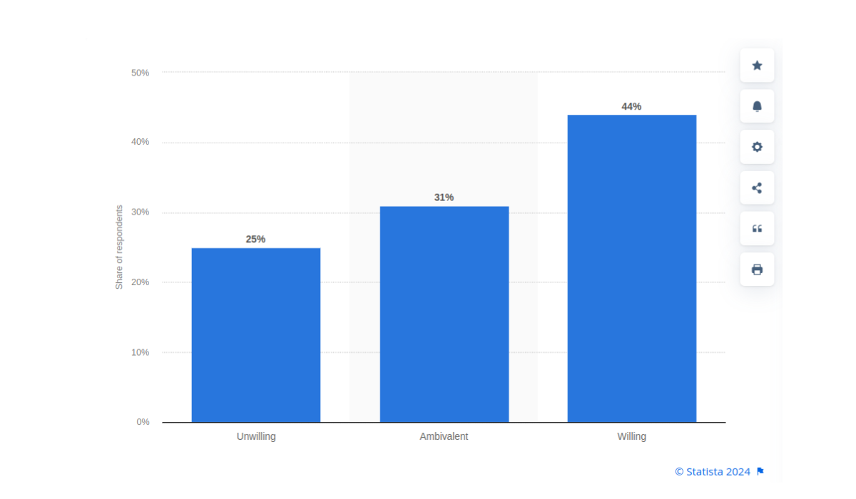 A global survey in 2022 showed that 44% of people were willing to accept AI systems in healthcare, while 31% remained ambivalent. As of 2024, this specific market is valued at $20.9 billion and is projected to reach $148.4 billion by 2029 indicating great interest in adopting AI in healthcare.