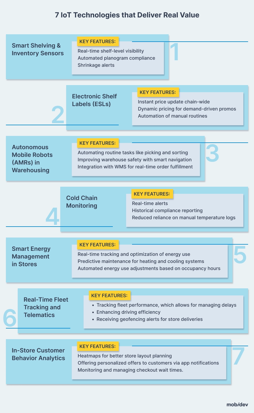 There are different types of IoT technology, some of which deliver value in the first place. Based on MobiDev’s experience and industry-wide research, we hand-picked 7 IoT use cases in retail that offer business-critical results when implemented.