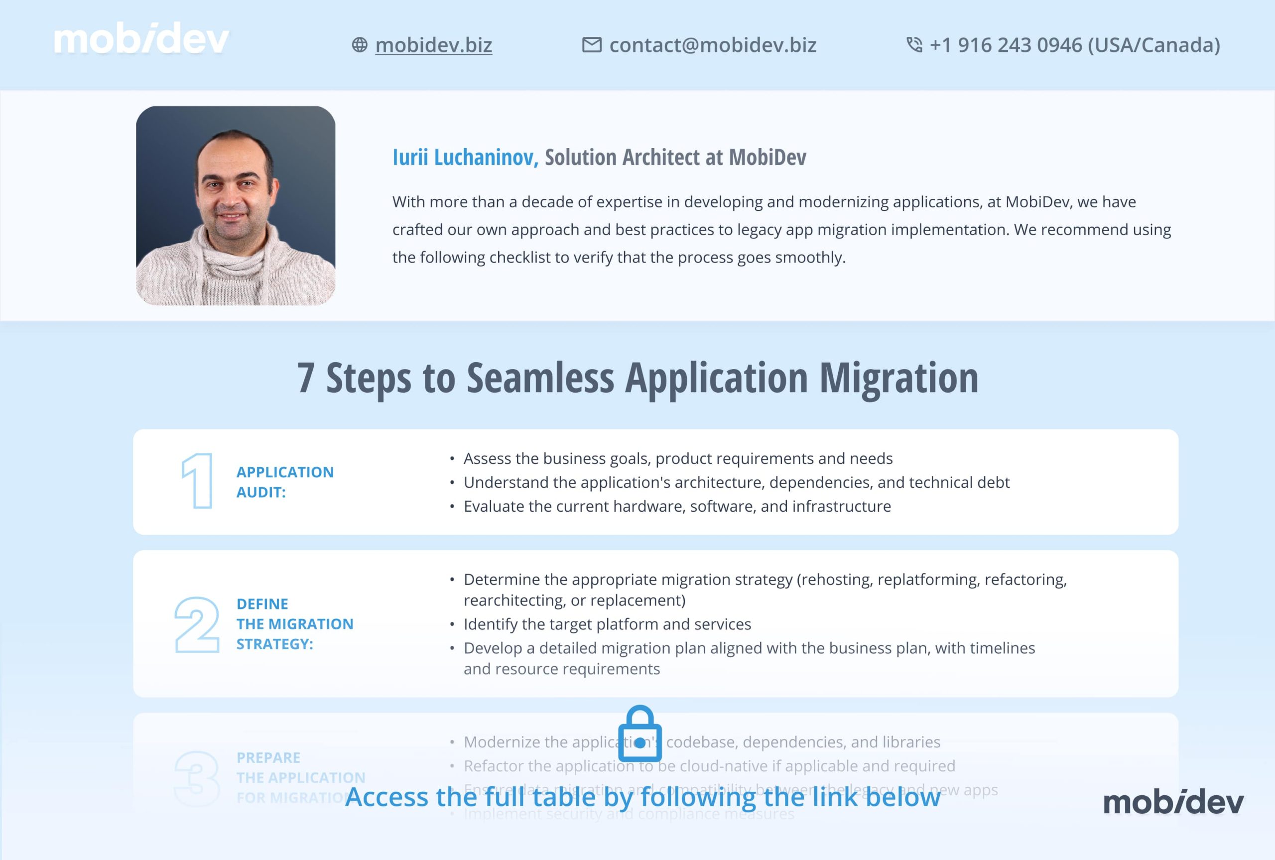With 14 years of expertise in developing and modernizing applications, the MobiDev team is always ready to support you. We recommend using the following checklist to verify that the legacy app migration process goes smoothly.