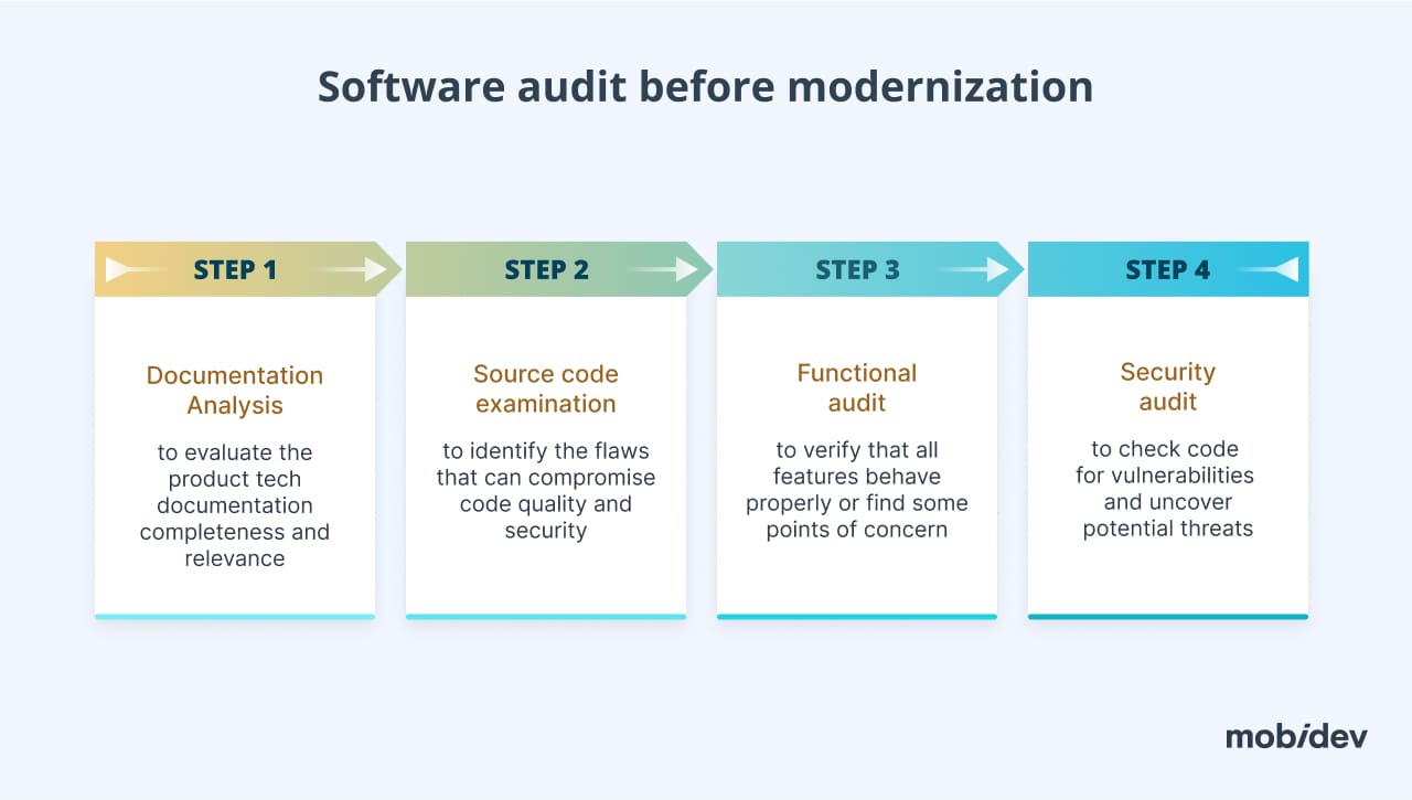 A software audit is a crucial step in modernization, and it is essential for identifying necessary changes and assessing possible modernization risks. The key principle is quite simple: before solving a problem, we need to understand its roots. A software audit helps identify tech debt in the project’s code and architecture and determine the risks associated with utilizing the product.