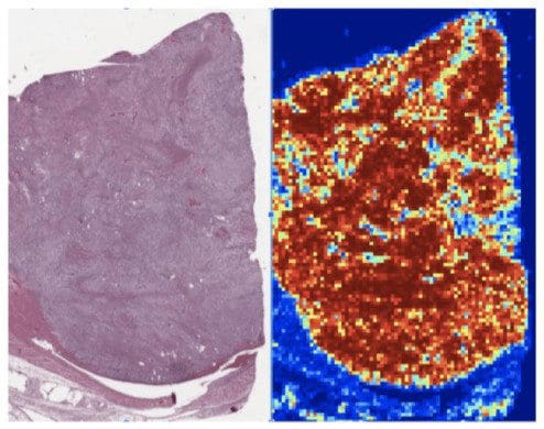As you can see on the image on the right, the AI support system highlights the regions of high risk where cancer cells are more likely to be. This eliminates the need to physically analyze the whole image of a kidney, providing hints for medical expertise and attention. Similar heatmaps are used for even closer and more high resolution analysis of kidney tissue.