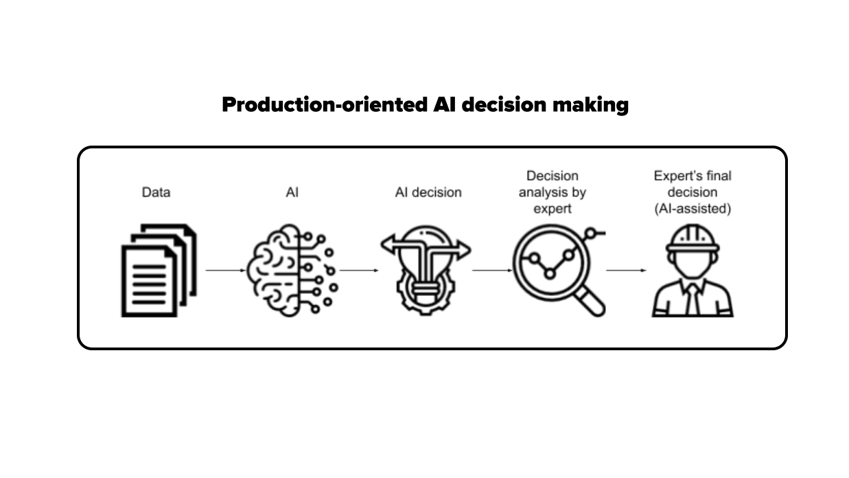 Production-oriented systems, in contrast, usually deal with critical decisions that require justification. This is like how a person in charge of a final decision is responsible for any possible financial loss or harm. In this case, the AI model acts as assistant for professional activity, providing explicit information for a decision maker.