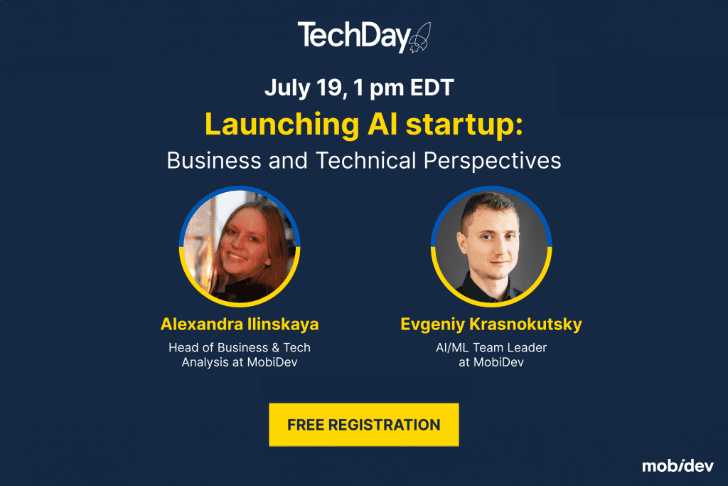 Despite the incredibly growing popularity of AI-driven app development, it’s still not a 100% straightforward area. Our experts Alexandra Ilinska and Yevhen Krasnokutsky will share their vision of the topic from both a technical and a business perspective. Join the free webinar organized by TechDay to explore the key pitfalls of launching a successful AI startup.