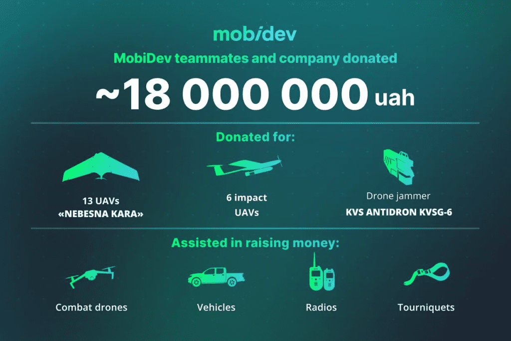 - Volunteered and donated to the Army. Joint efforts of MobiDev and our teammates resulted in 18 000 000 UAH donations for purchasing reconnaissance and combat drones, as well as vehicles